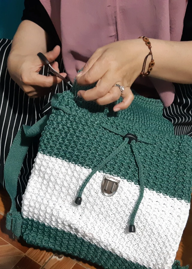 Kami berfokus pada pembuatan produk rajut seperti tas, cardigan, sweater, dan dompet rajut dengan sistem mesin rajut manual non-komputer.